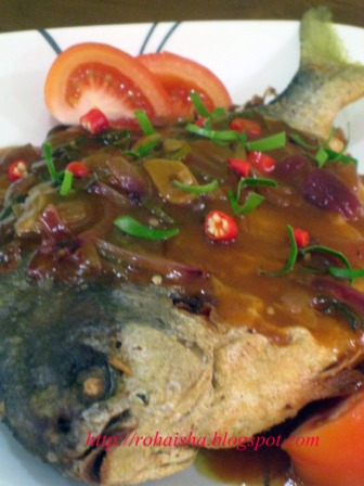 Setiap kali beli ikan bawal mesti terpaksa intai2 blog sahabat di luar sana coz nak cari resepi yang enak2 untuk disantap.. tapi biasanya kalau buzy sangat saya buat masak masam manis versi sendiri je..Kali ni dapat satu resepi yang dirasakan 'up' camtu bila tengok bahan-bahannya yang mudah dan dibabayang-bayangkan sedap apabila selesai dimasak..ehehe..itulah saya punya data dalam kepala setiap kali tengok blog sahabat2..Tapi sememangnya tak mengecewakan...berbaloi ape...Thanks untuk tuan punya resepi asal iaitu Dr Liana..untuk resepinya yang dijamin sedap ni.Apapun thanks juga buat Kak Yatie & dapur basahnya yang menjadi rujukan saya mendapatkan resepi yang terbaik ni...Sedappp ape!!